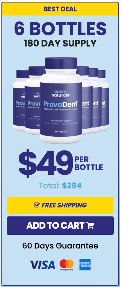 Your Purchase Is 100% Risk-Free! Ordering ProvaDent is a completely risk-free decision. We proudly stand behind our product with a 60-day, 100% money-back guarantee. If you’re not satisfied for any reason, simply request a refund — no questions asked. Even empty bottles are accepted. You have nothing to lose and a healthier smile to gain!